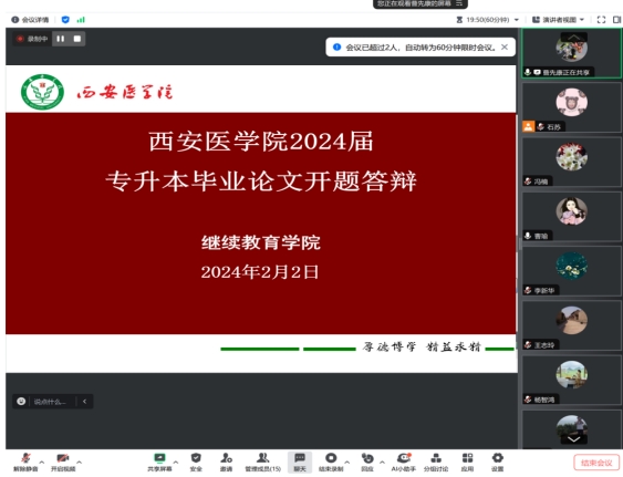 为提高成人专升本员工毕业论文撰写质量,保障成人学历教育人才培养质量,beat365亚洲体育官方网站于2月2日举行了2024届成人专升本毕业生论文线上开题答辩会议。公共事业管理专业是公司目前唯一有毕业论文(设计)要求的专业,公司高度重视员工毕业论文撰写工作,为每位员工配备1名导师精心指导,规范了论文撰写流程及标准,在各个环节上确保做到组织无误。会前公司成立了以李新华副经理为组长,王志玲、冯楠、曹弘毅、李妮、张典、段云燕6名专业骨干教师为评审专家的开题答辩小组。