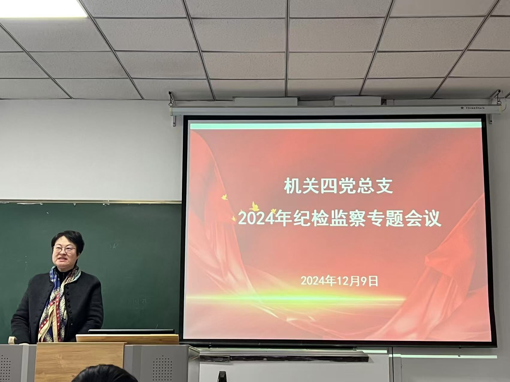 最后,机关四党总支书记靳红樱就机关四党总支2024 年纪检监察工作总结进行汇报。靳书记全面回顾了本年度纪检监察工作的开展情况,总结了取得的成绩与经验,同时也深入剖析了存在的问题与不足,并提出了针对性的改进措施与今后工作计划。她强调,党风廉政建设是一项长期而艰巨的任务,全体党员、干部和职工必须时刻保持警醒,坚守廉洁底线,以实际行动推动机关四党总支纪检监察工作再上新台阶。