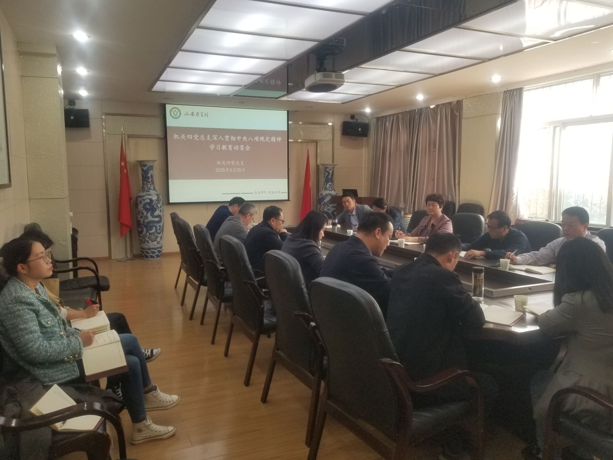按照公司党委工作安排,3月25日下午,机关四党总支在高新校区二楼会议室召开深入贯彻中央八项规定精神学习教育动员部署会。会议由机关四党总支书记靳红樱主持,机关四党总支全体党员干部参加会议。